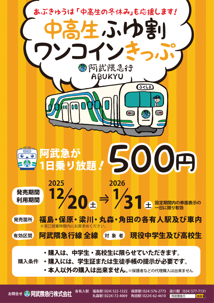 「中高生ふゆ割ワンコインきっぷ」が販売開始となります。この機会に是非、ご利用ください。