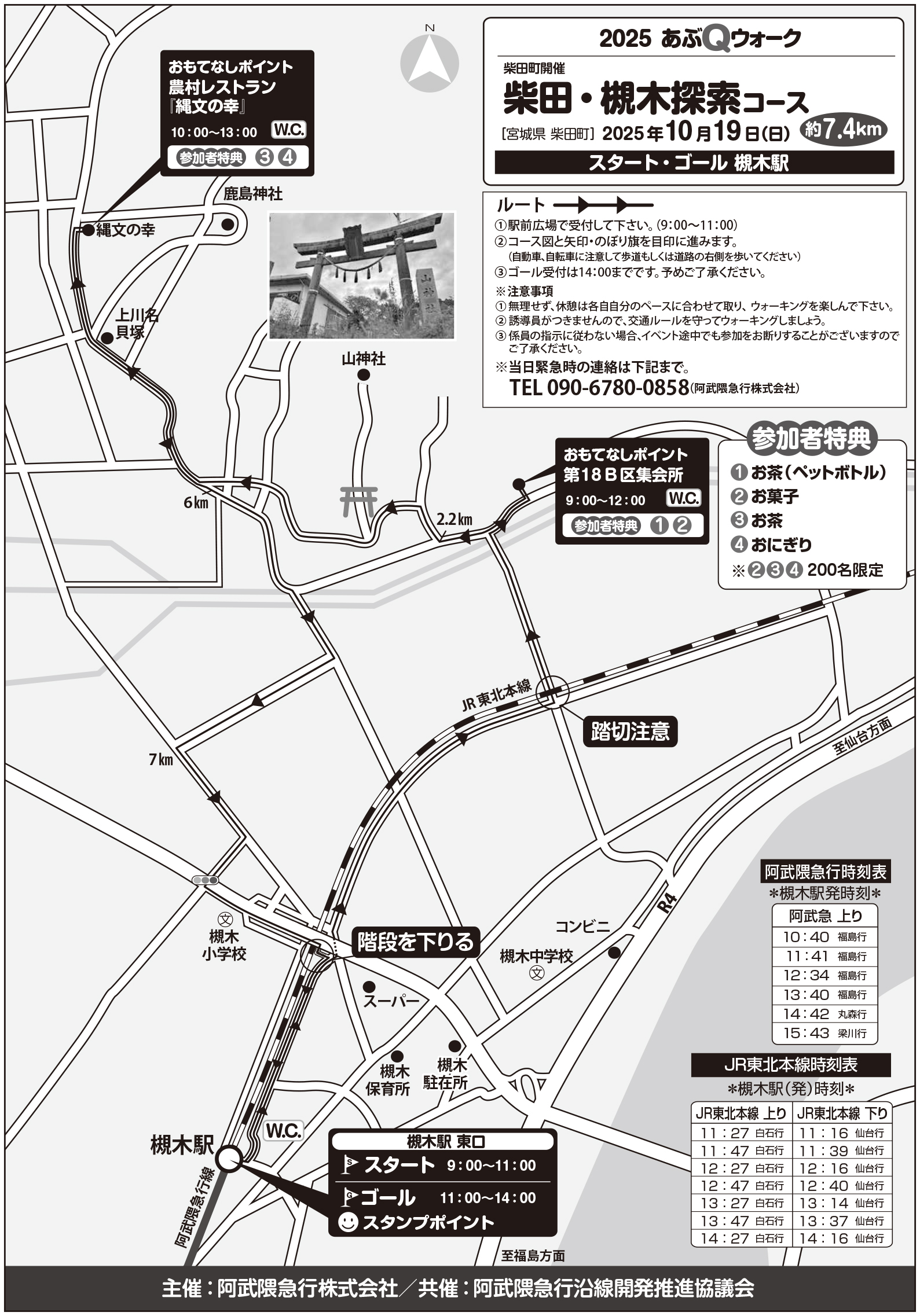 - 小雨決行としますが、開催に関しましては、当日(AM6:00 ~ AM8:00)、福島駅TEL 024-522-1322 /角田駅TEL 0224-62-4610 まで問い合わせ願います。