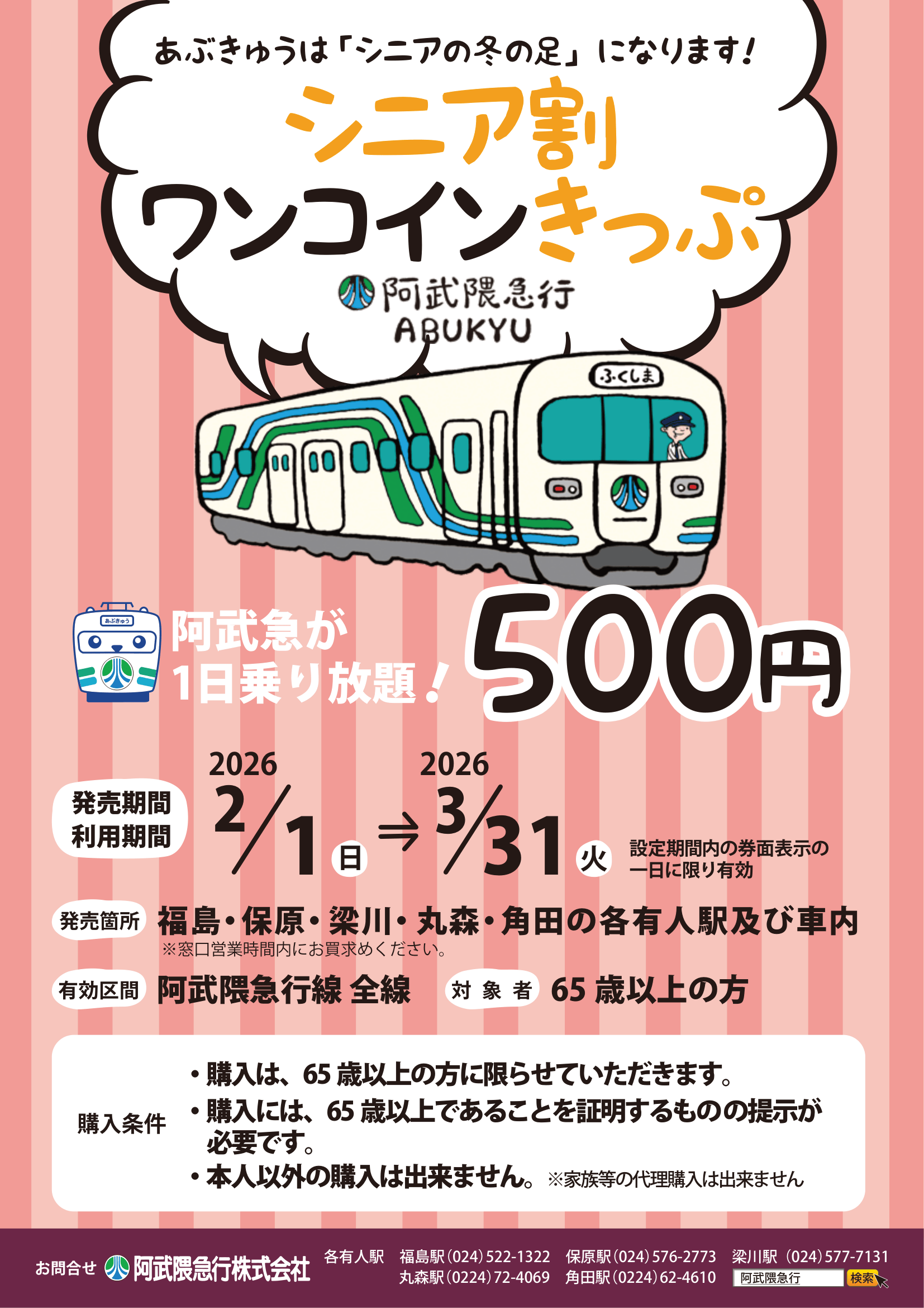 今年もシニアを応援します。! 2026/02/01 本年も500円で阿武隈急行線1日乗り放題ワンコイン切符を販売開始します。寒さ厳しいこの時期、阿武急で安全に移動されてはいかがでしょうか。❏ 発売期間・利用期間 2026年2月1日(日)~2026年3月31日(火)❏ 対象者 シニアの方(65歳以上) ・年齢確認ができるものを提示願います。 (代理購入はできません。)❏ 発売場所 ・各有人駅(福島・保原・梁川・丸森・角田) ・車内でも発売します。
