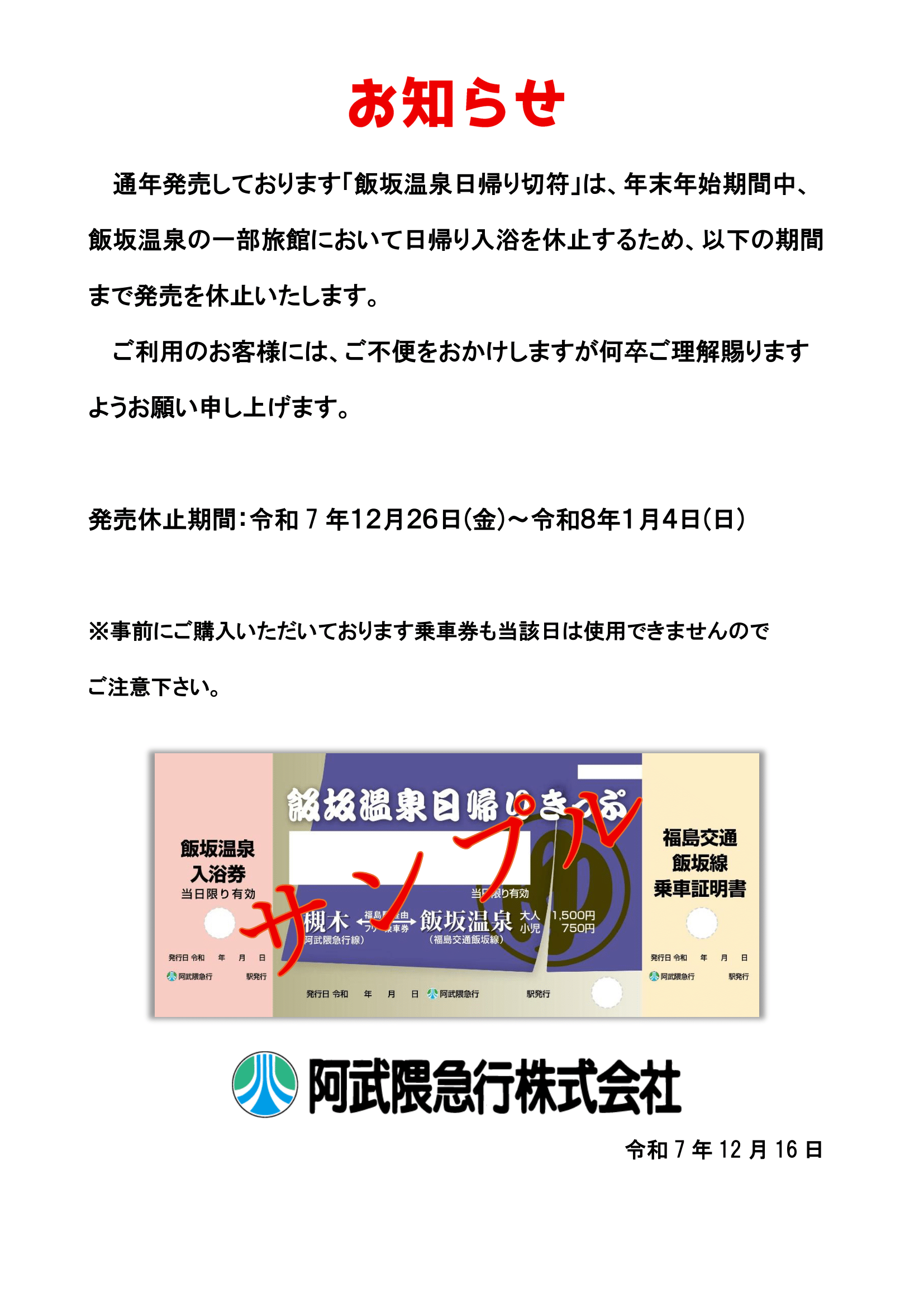 飯坂温泉日帰り切符発売休止のお知らせ