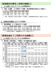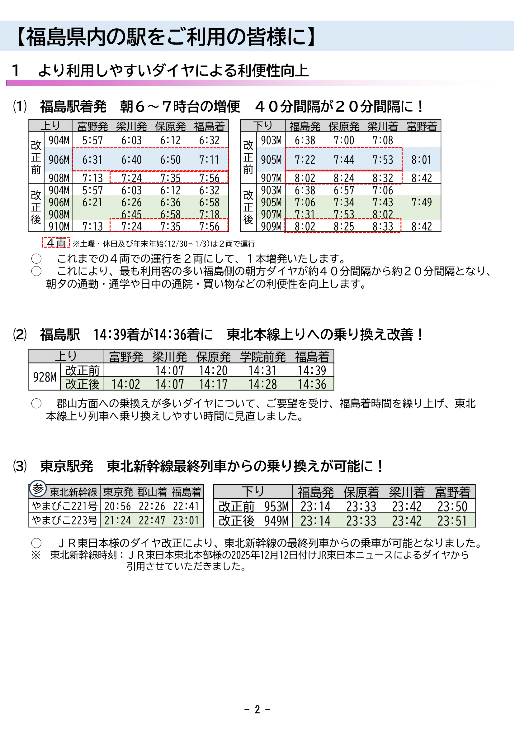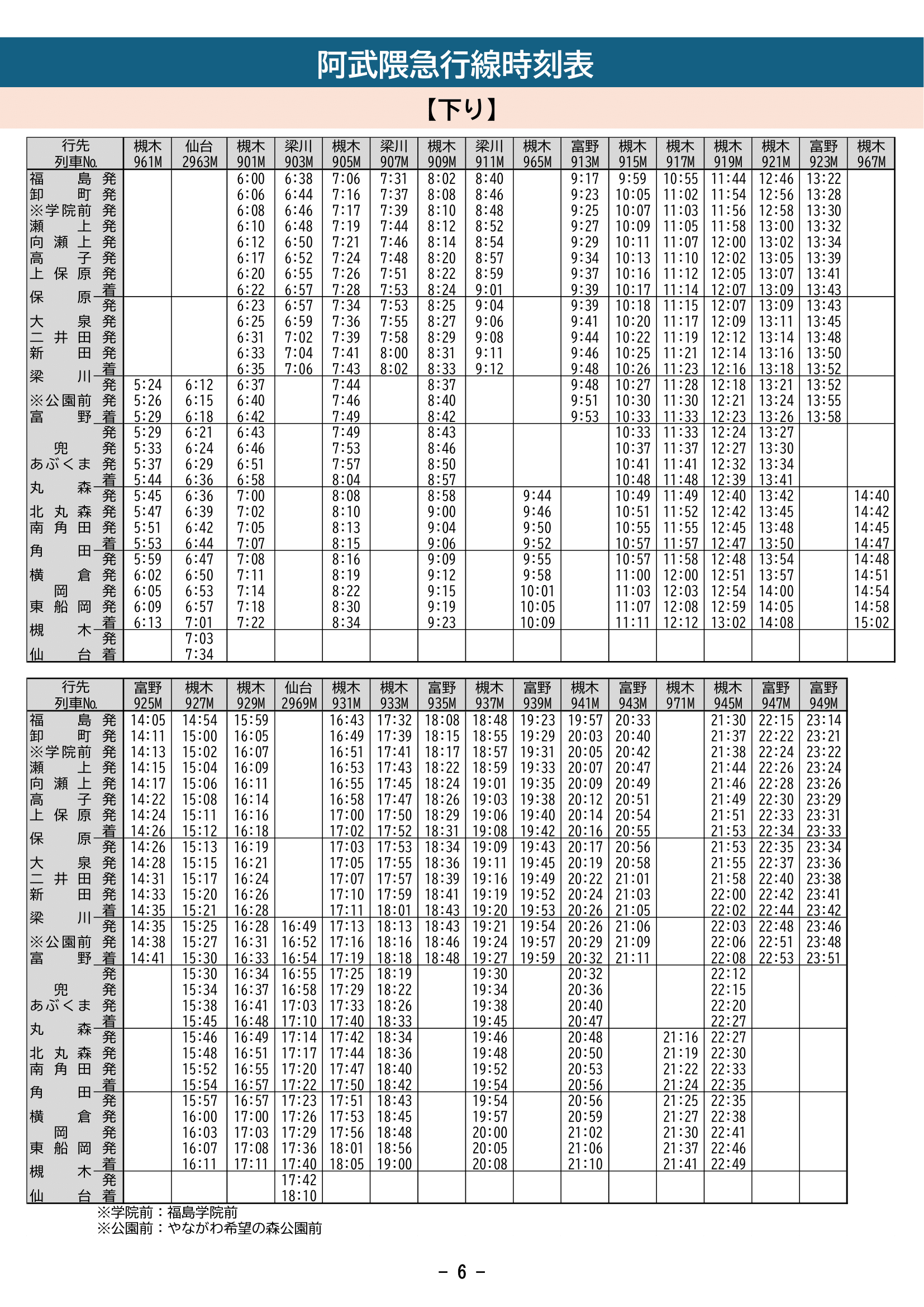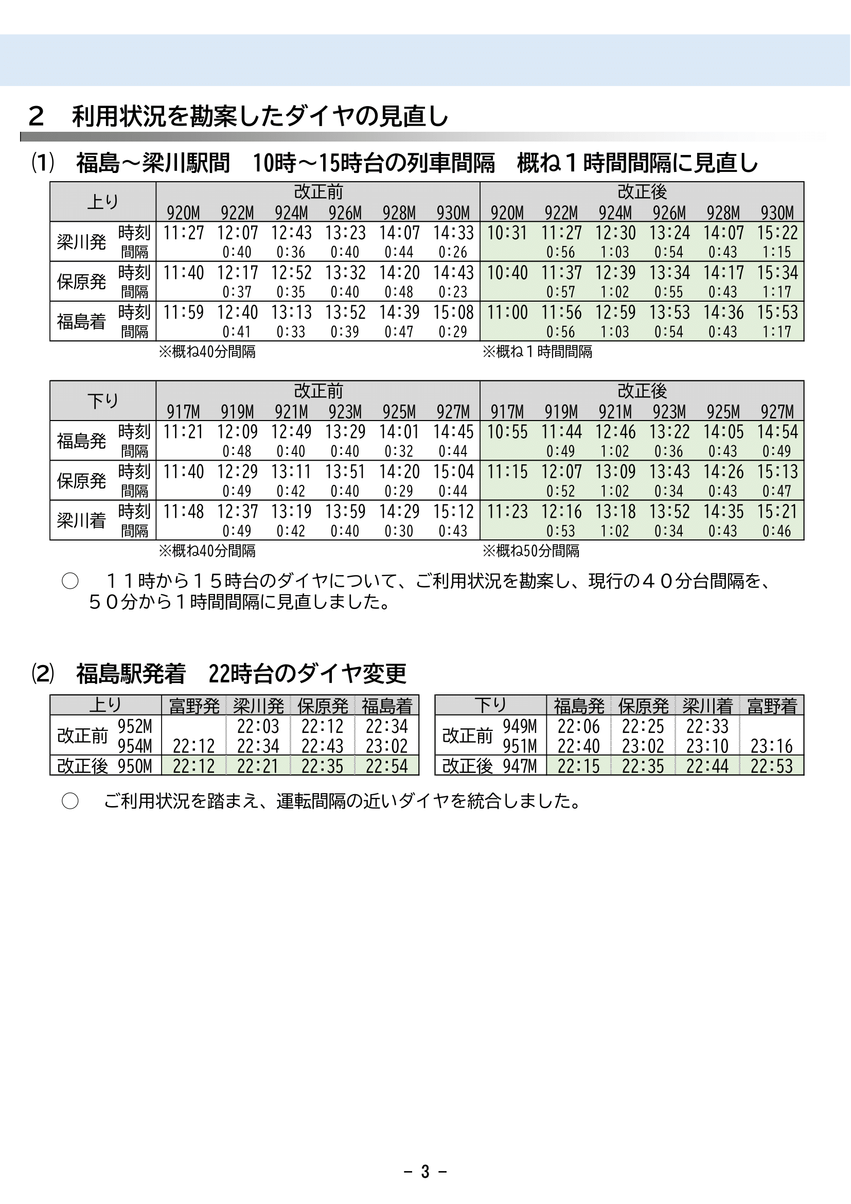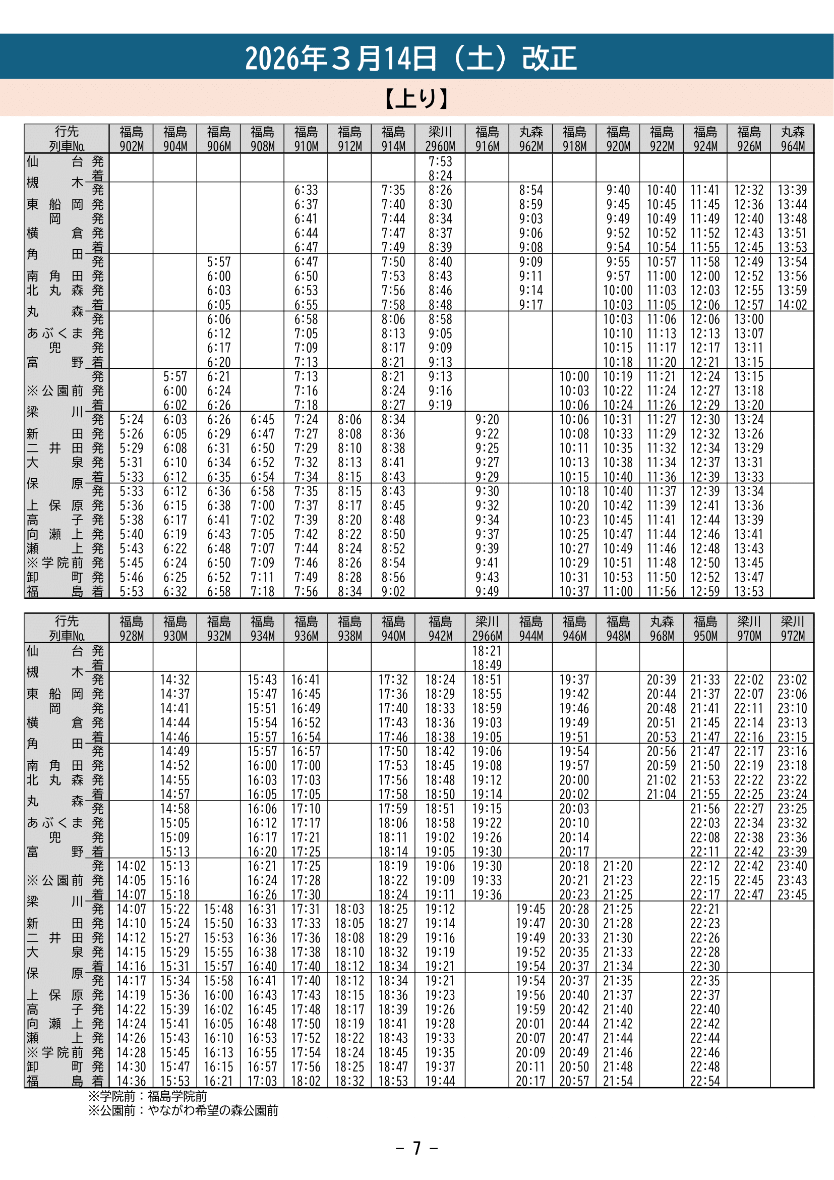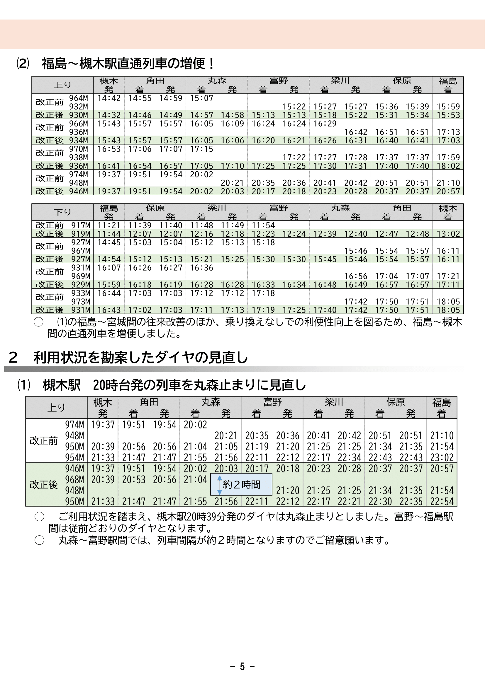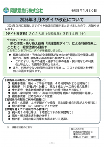 2026年3月14日 ダイヤ改正を実施します。 2026/01/20 阿武隈急行では、2026年3月14日にダイヤ改正を実施いたします。 内容については、下記資料をご確認くださいますようお願い致します。 今回改正の注目点 福島県内の駅をご利用の皆様へ 宮城県内の駅・県境を越えてご利用される皆様へ 2026年3月14日 改正後 時刻表 下り 上り