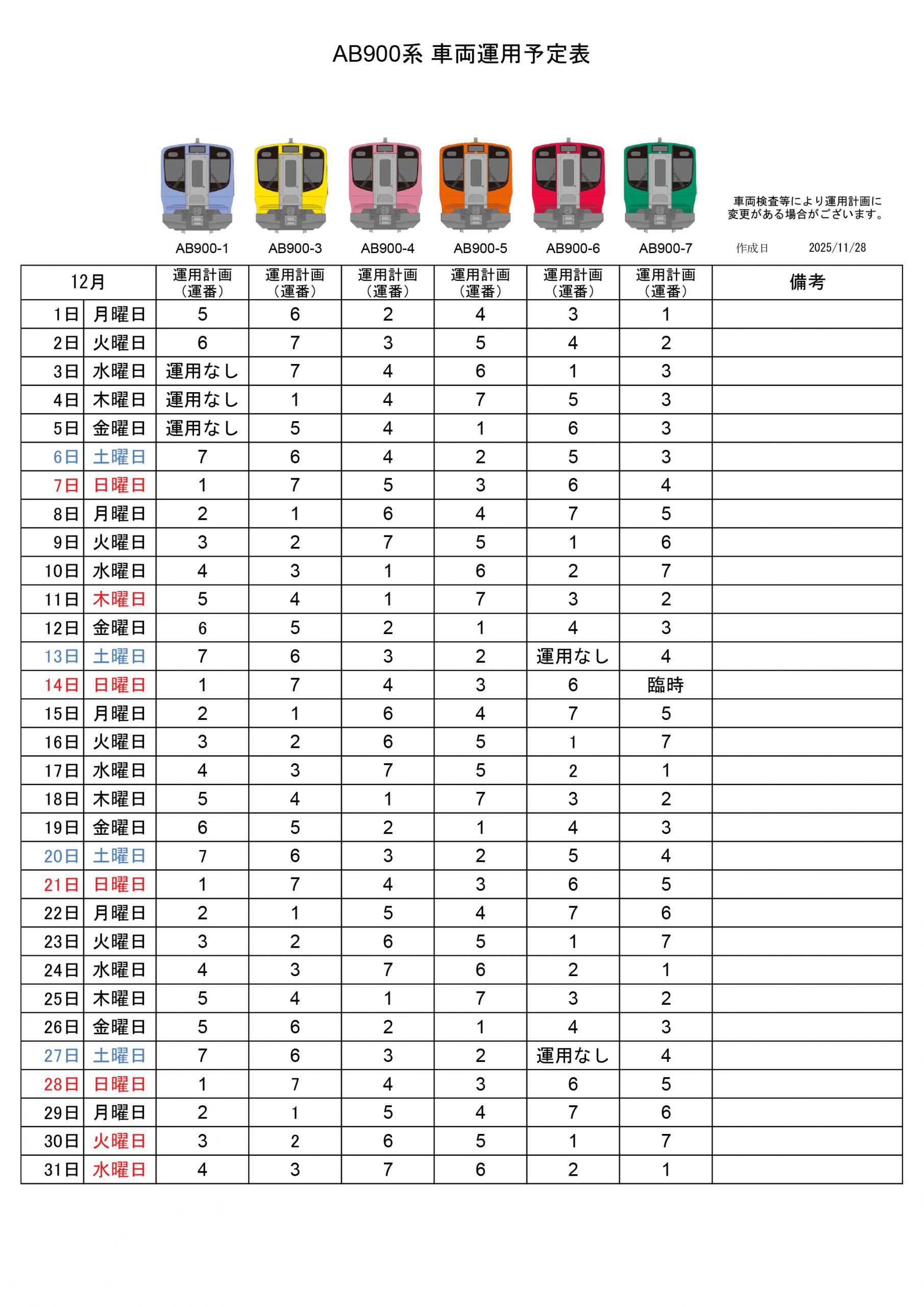 AB900系 車両運用予定表 HOMEAB900系 車両運用予定表 AB900系 車両運用予定表 作成日 2025年12月1日 >> PDF(全ページをまとめてご覧いただけます) >> JPEG(各ページごとに分割されています) 車輌運行予定表12月 運用計画番号[ 1 ] 運用計画番号[ 2 ] 運用計画番号[ 3 ] 運用計画番号[ 4 ] 運用計画番号[ 5 ] 運用計画番号[ 6 ] 運用計画番号[ 7 ] ※ 車両検査等により運用計画に変更がある場合がございます。